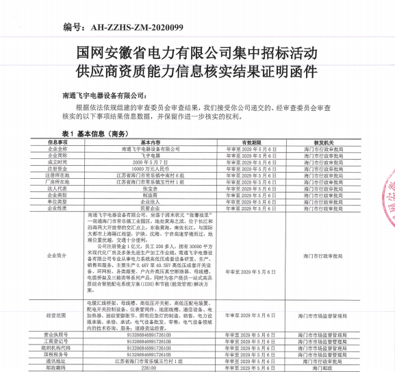 2020年6月10日, 我公司顺利通过国网安徽省电力有限公司低压开关柜的供应商资质能力核实,获得《供应商资质能力核实证明》(简称“一纸证明”)。