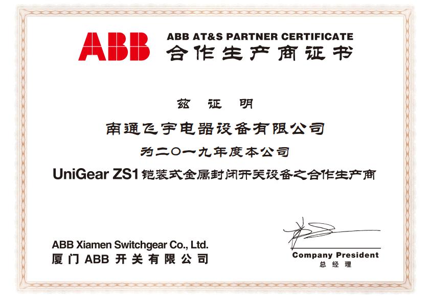 近日,南通飞宇电器设备有限公司获得二零一九年度ABB开关有限公司合作生产商证书,为UniGear ZS1铠装式金属封闭开关设备之合作生产商。现本公司已获得高新技术企业,江苏省民营科技企业,南通名牌产品,安全生产标准化,知名品牌ABB合作生产商等证书。